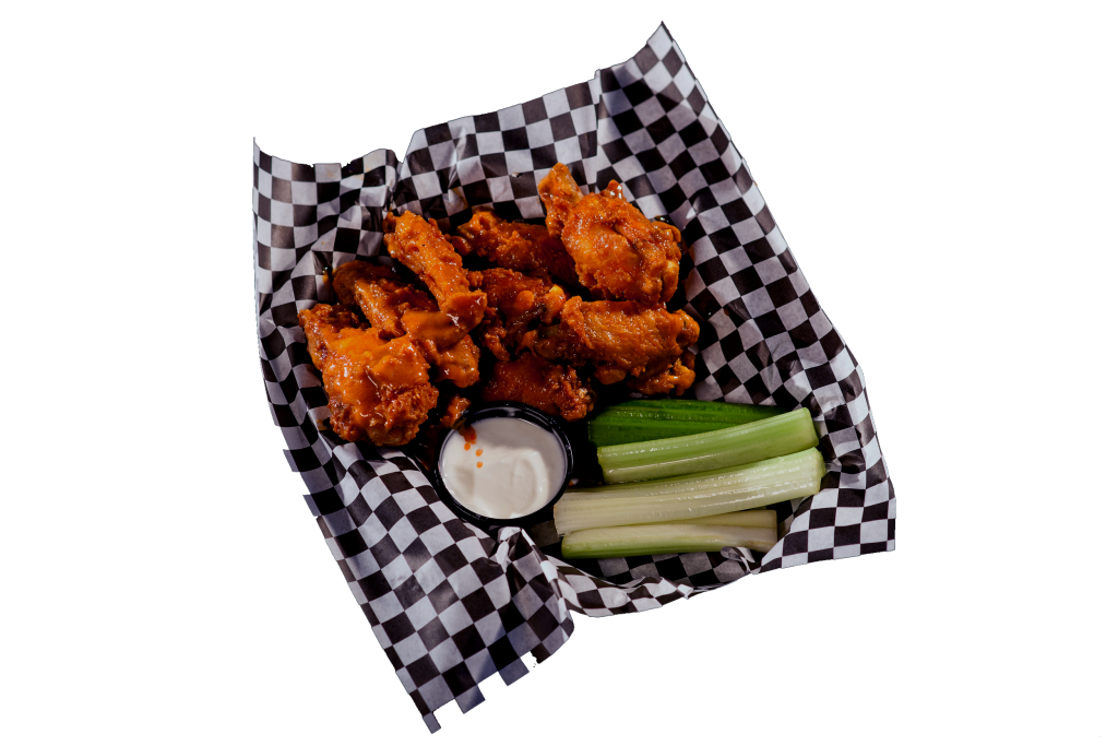 Tossed in your choice of wing sauce and served with bleu cheese or ranch and carrots & celery.