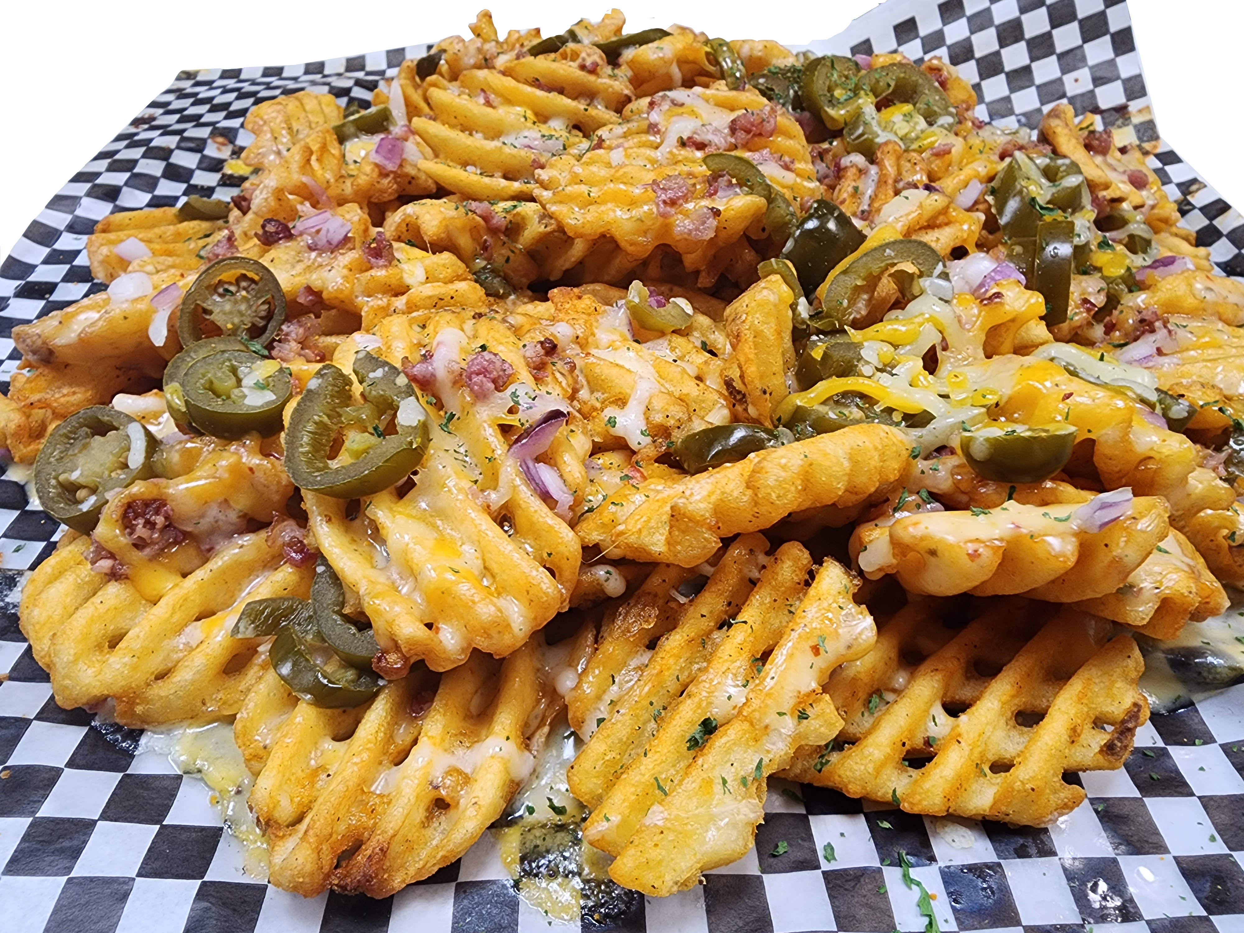 Waffle fries done right! Topped with our house queso, bacon, red onion, and jalapeños.