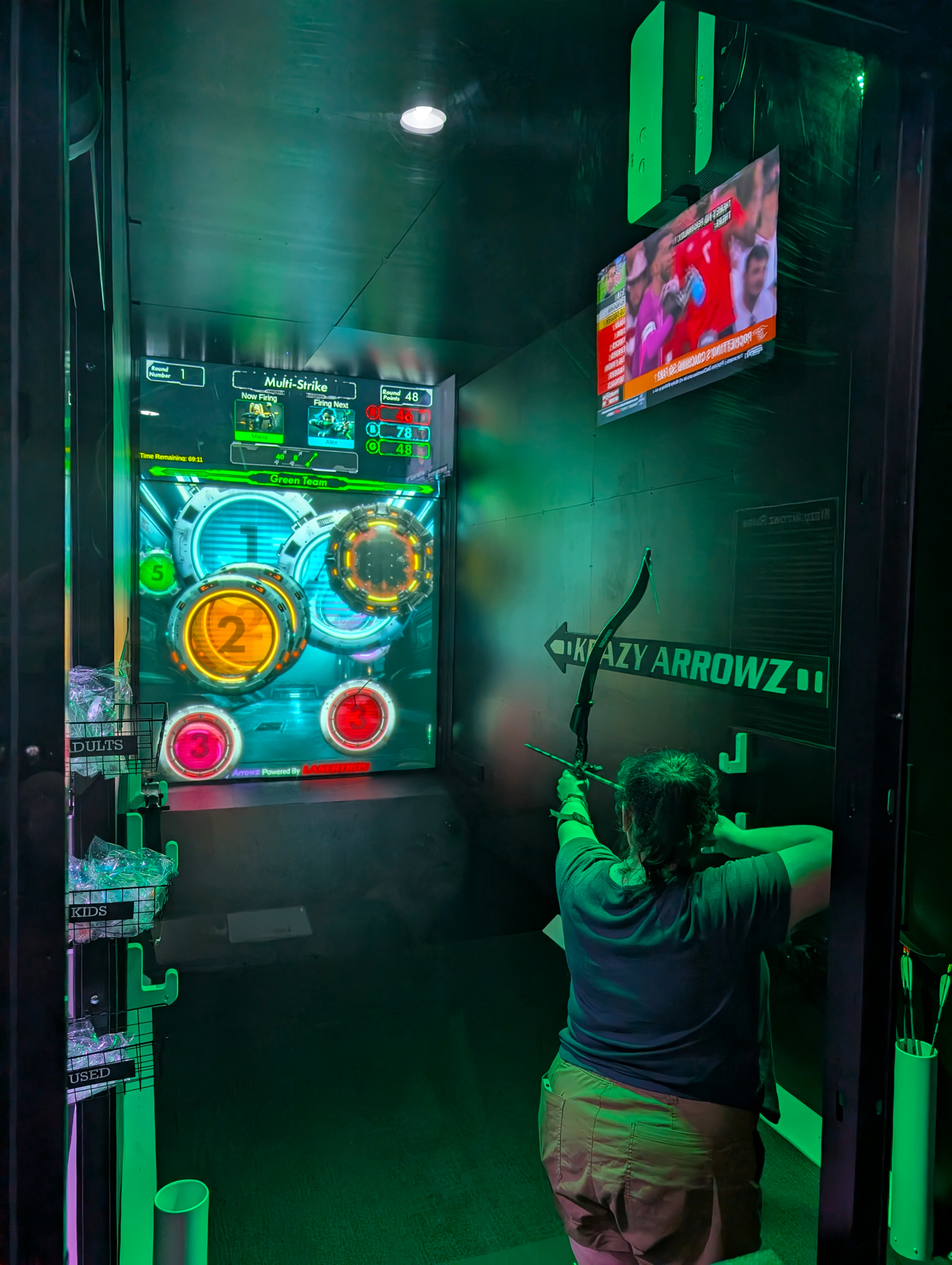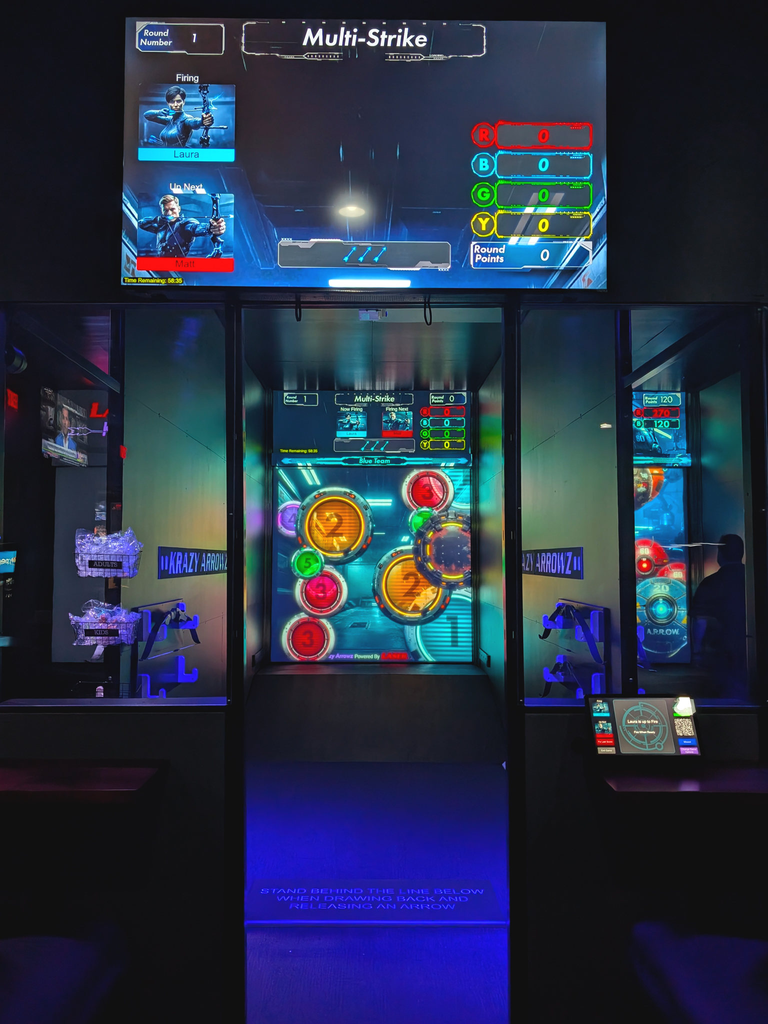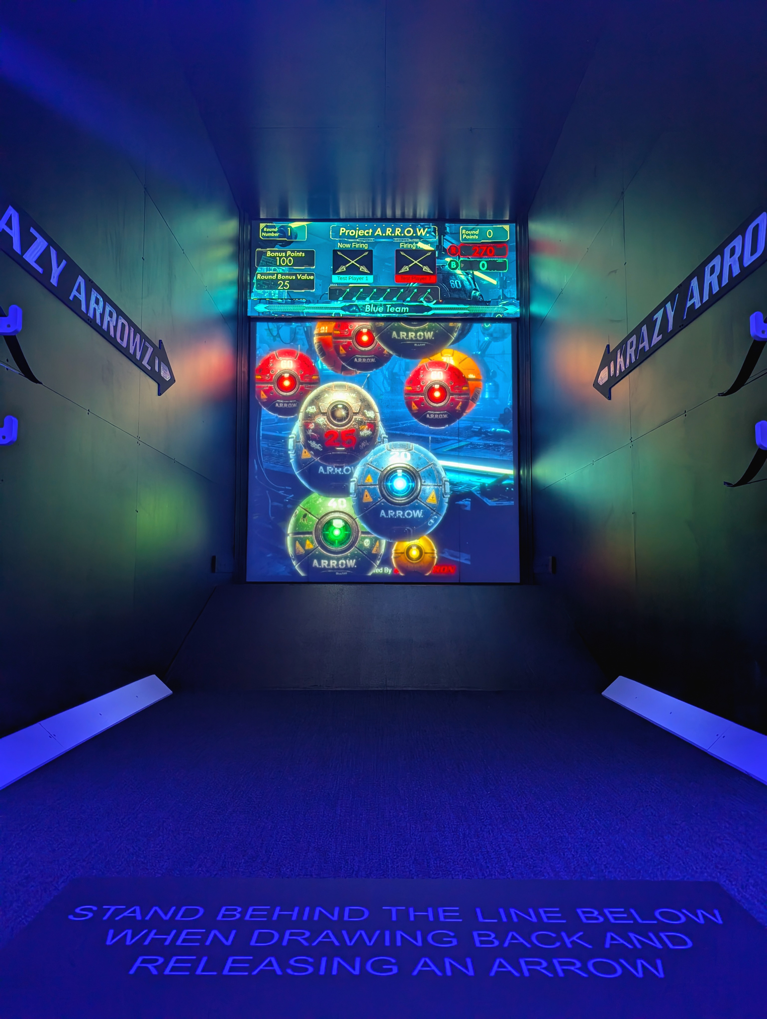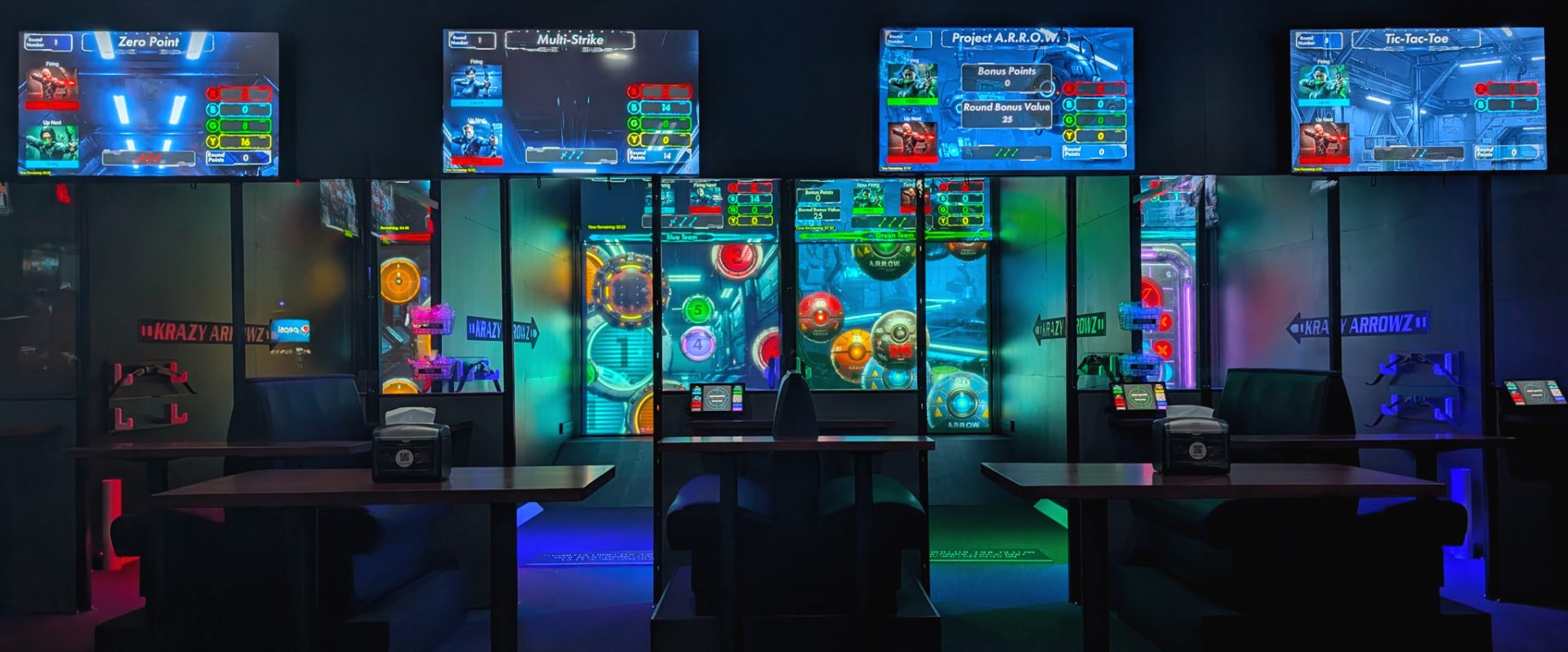 This groundbreaking attraction fuses live archery with fast-paced digital gameplay. Using real arrows, players will fire at a massive interactive screen loaded with games that test precision, speed, and strategy. From competitive team battles to trivia challenges, Krazy Arrowz delivers the thrill of real archery in a safe, high-tech environment. Whether you're a first-timer or a seasoned marksman, it's time to aim, fire, and go Krazy, only at LASERTRON.