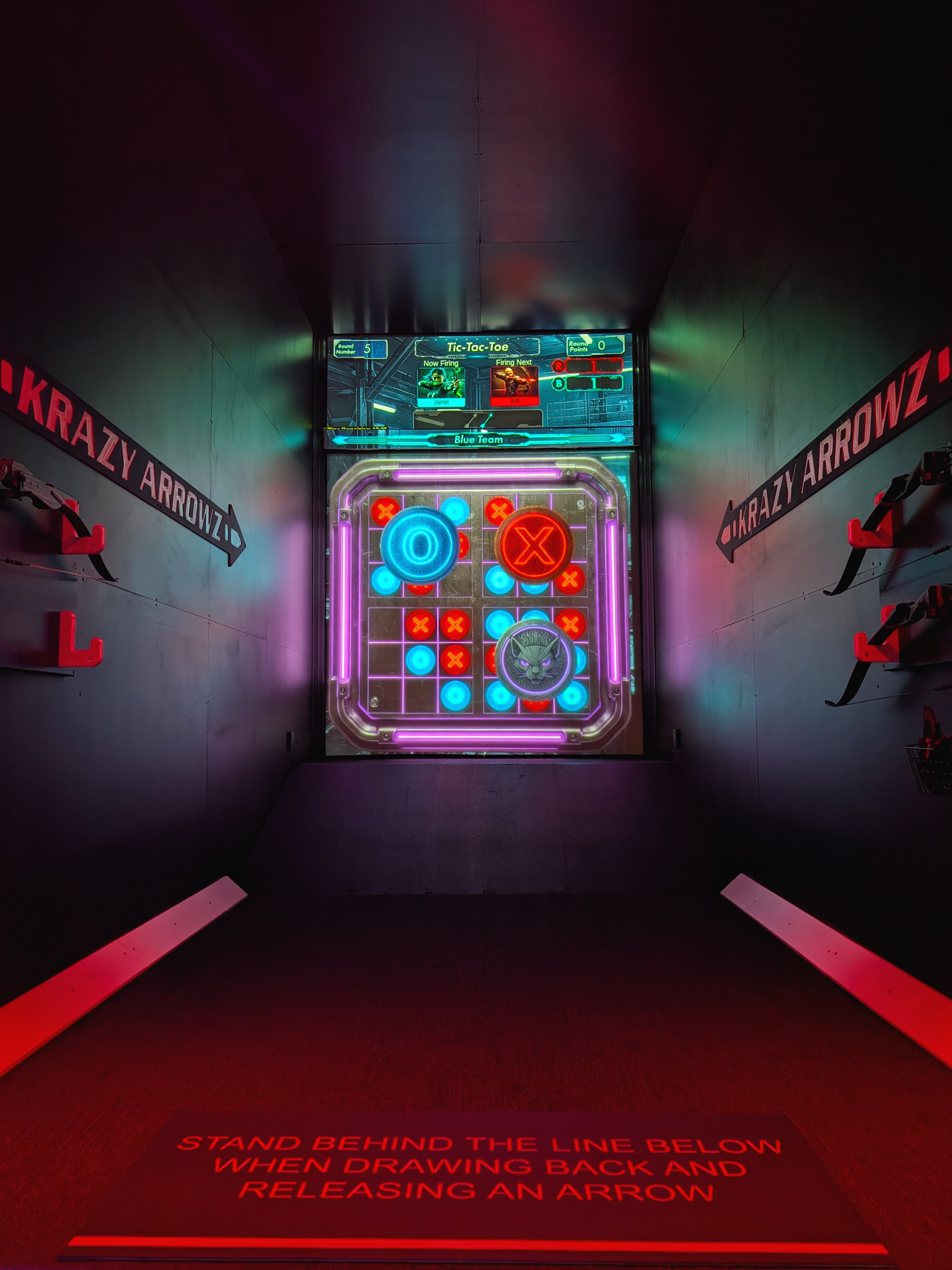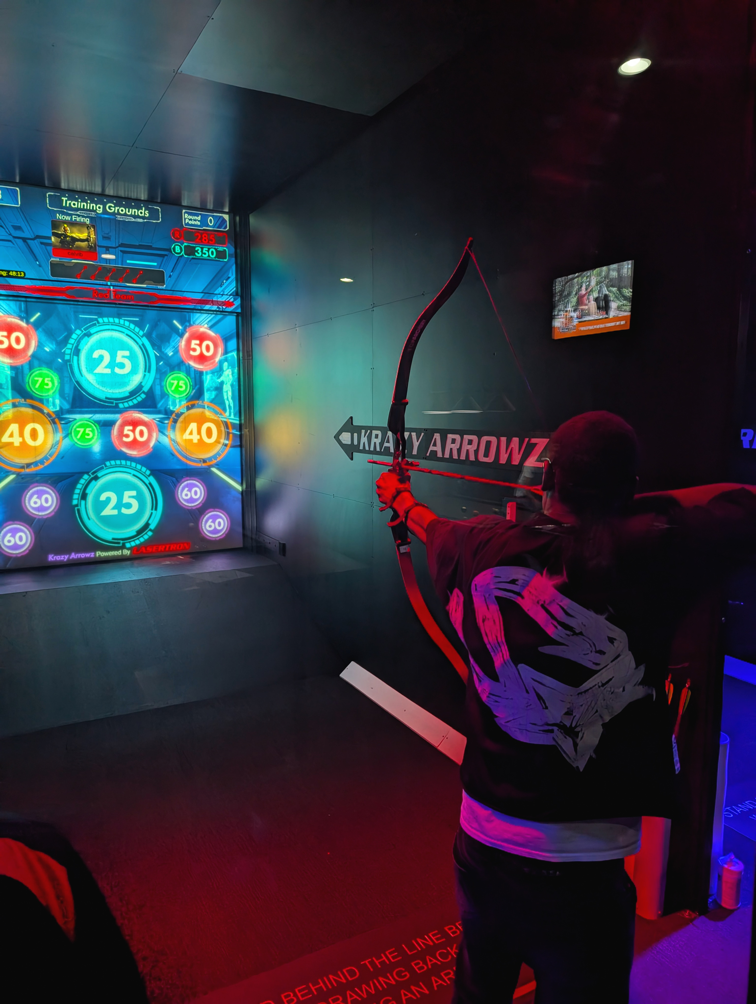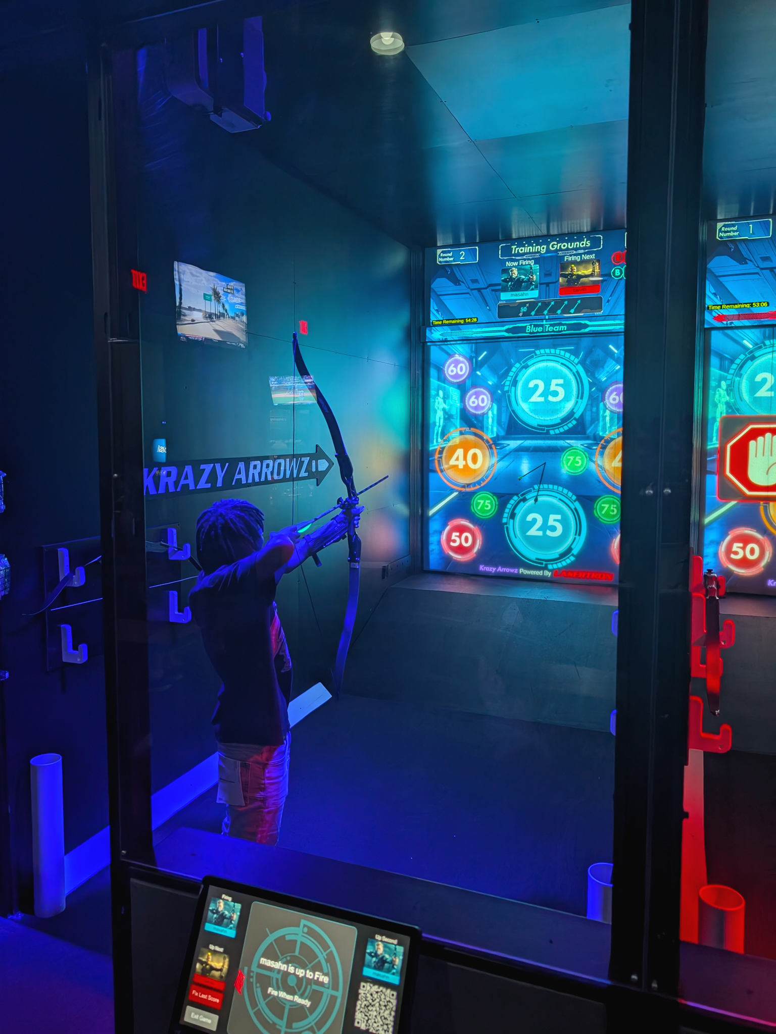 This groundbreaking attraction fuses live archery with fast-paced digital gameplay. Using real arrows, players will fire at a massive interactive screen loaded with games that test precision, speed, and strategy. From competitive team battles to trivia challenges, Krazy Arrowz delivers the thrill of real archery in a safe, high-tech environment. Whether you're a first-timer or a seasoned marksman, it's time to aim, fire, and go Krazy, only at LASERTRON.