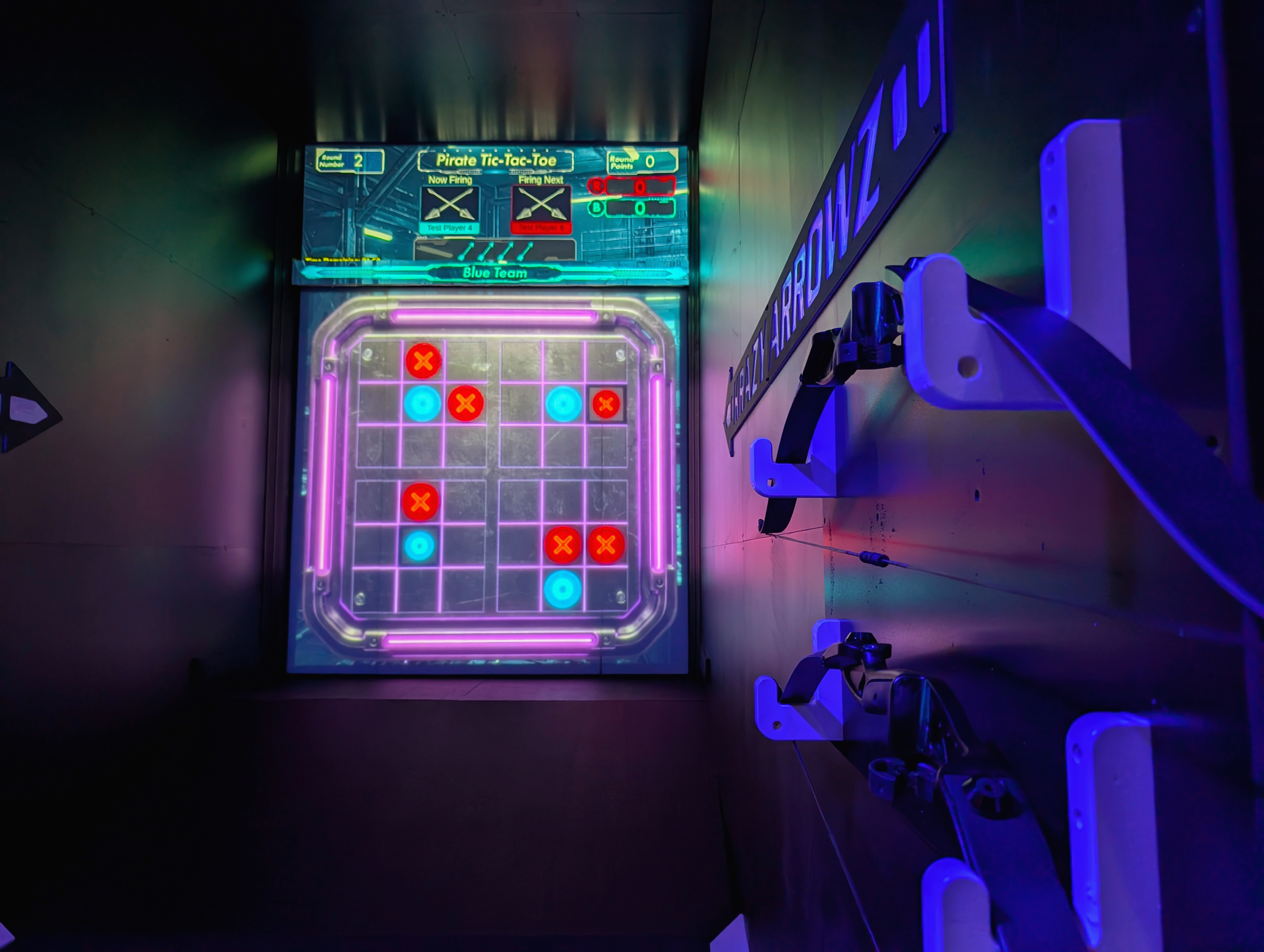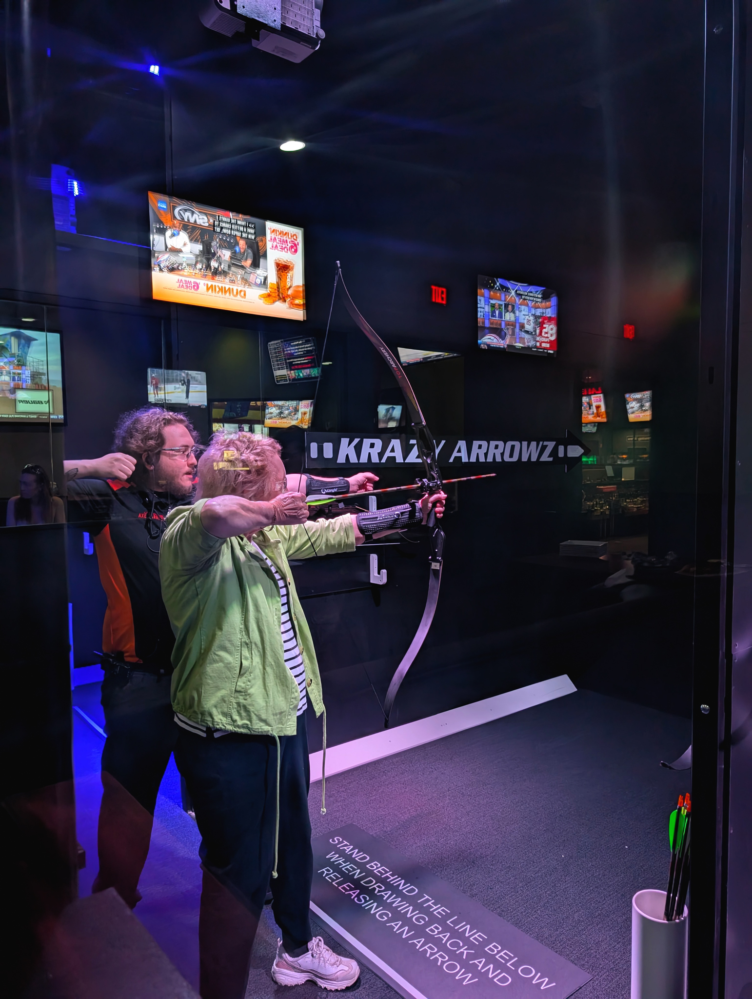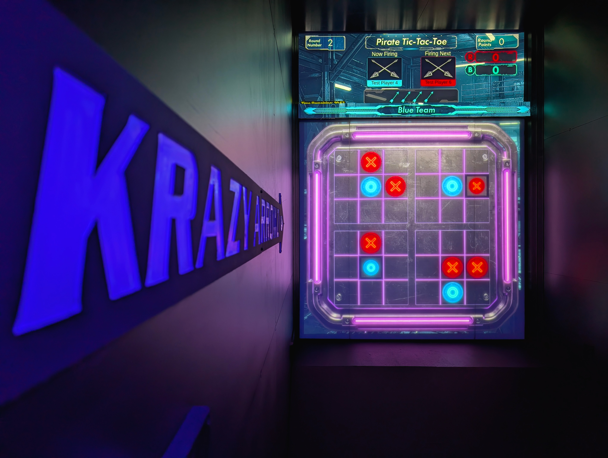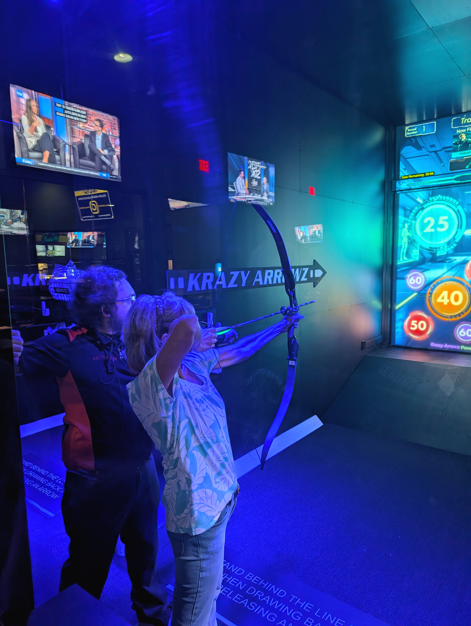 This groundbreaking attraction fuses live archery with fast-paced digital gameplay. Using real arrows, players will fire at a massive interactive screen loaded with games that test precision, speed, and strategy. From competitive team battles to trivia challenges, Krazy Arrowz delivers the thrill of real archery in a safe, high-tech environment. Whether you're a first-timer or a seasoned marksman, it's time to aim, fire, and go Krazy, only at LASERTRON.
