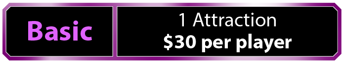 See below for the attractions you can play, food options ranging from gourmet pizzas to prime rib carving stations, drink package options, and extras you can add-on to make your event one you’ll never forget!
