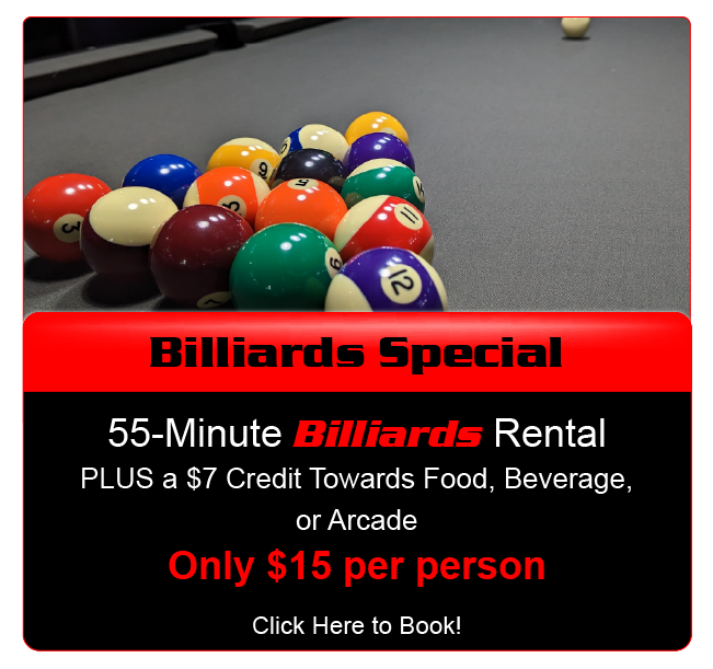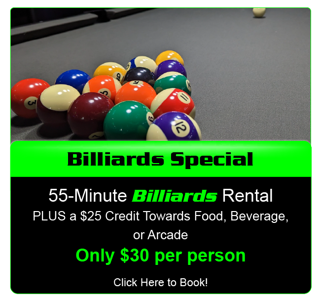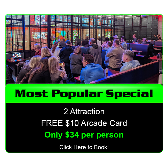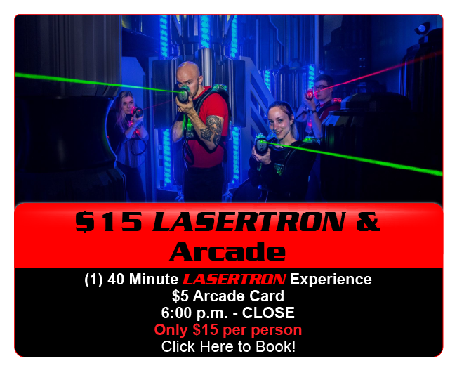 Specials Multiple Attractions All You Can Play Must be 18 or older Must be 18 or older LASERTRON Laser Tag Krazy Arrowz Billiards Drinks Gift Cards - Only available to purchase in-store. Gift Cards available for purchase in store during our hours of operation.  Hours - Click Here Tag us on Instagram @lasertronroc and receive a $10 arcade card