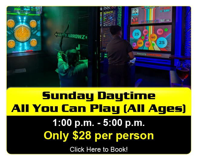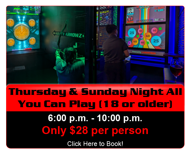 Our Purpose Creating friendly & safe places where our guests can socialize, play, laugh, eat, drink, and be happy. Specials Multiple Attractions All You Can Play Must be 18 or older Must be 18 or older LASERTRON Laser Tag Krazy Axes Krazy Arrowz Krazy Darts Billiards Drinks Gift Cards - Only available to purchase in-store. Gift Cards available for purchase in store during our hours of operation.  Hours - Click Here Tag us on Instagram @lasertronroc and receive a $10 arcade card